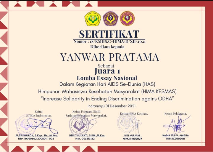 Semarang, 1 Desember 2021 – Prestasi membanggakan kembali ditorehkan oleh mahasiswa UIN Walisongo Semarang, khususnya dari Fakultas Ilmu Tarbiyah dan Keguruan (FTIK), Program Studi Manajemen Pendidikan Islam (MPI). Tiga mahasiswa MPI berhasil meraih Juara I dalam ajang Lomba Essay Nasional yang diselenggarakan dalam rangka peringatan Hari AIDS Sedunia (HAS) oleh Himpunan Mahasiswa Kesehatan Masyarakat STIKes Indramayu pada 1 Desember 2021.