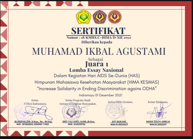 Tidak kalah membanggakan, Muhamad Ikbal Agustami turut meraih Juara I dengan gagasan yang kritis dan berbasis nilai-nilai kemanusiaan. Dalam esainya, Ikbal mengangkat pentingnya penguatan literasi kesehatan dan kolaborasi lintas sektor sebagai strategi untuk menghapus stigma terhadap ODHA. Pemikirannya dinilai mampu memberikan perspektif baru yang konstruktif dalam menjawab persoalan sosial tersebut.